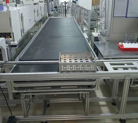14) 帶式輸送機(jī)的結(jié)構(gòu)形式有:槽型帶式輸送機(jī)、平型帶式輸送機(jī)、爬坡帶式輸送機(jī)、轉(zhuǎn)彎帶式輸送機(jī)、伸縮帶式輸送機(jī)等多種形式,還可以在輸送帶上增加擋板、裙邊等附件,可以滿足各種工藝要求。輸送機(jī)兩側(cè)配有工作臺、燈架,可作為電子儀表、食品包裝等帶式輸送機(jī)的裝配線。